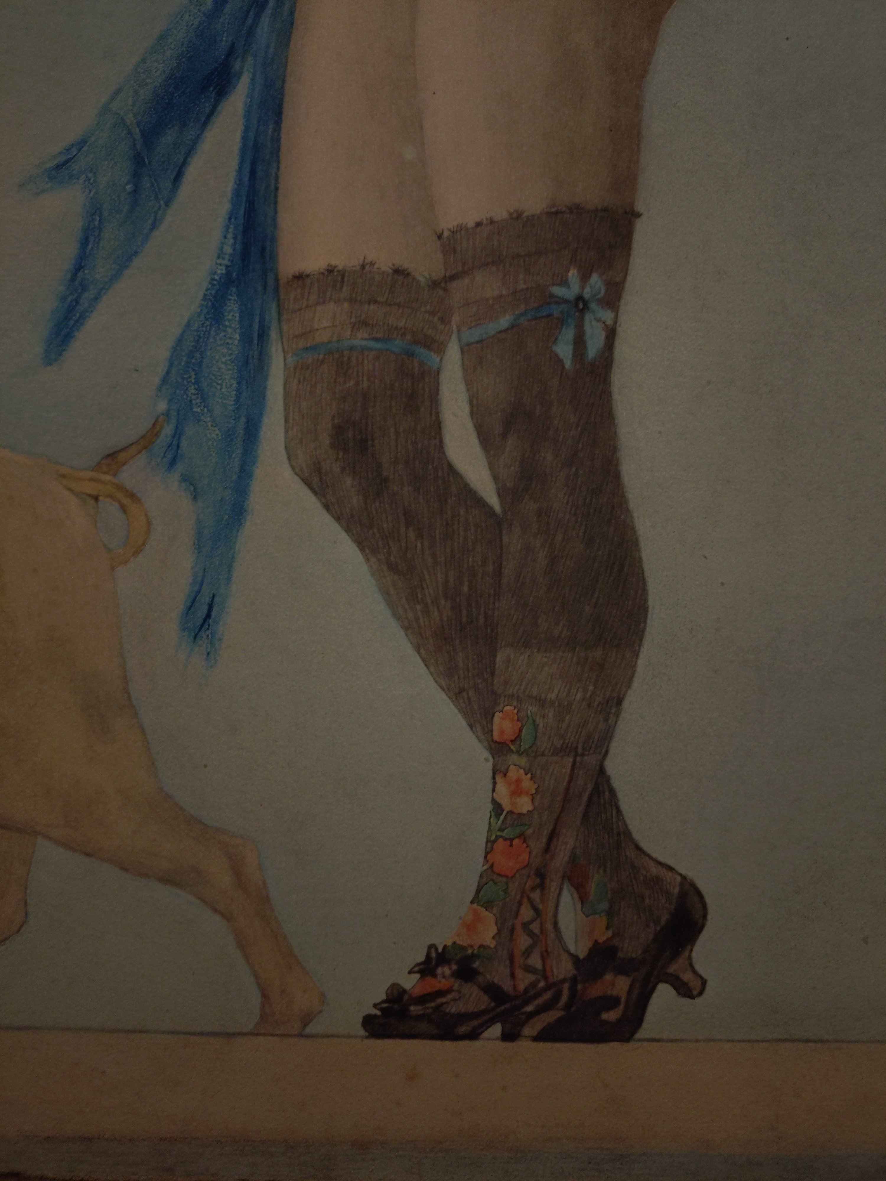 全体の大まかなタッチに対し、ストッキングと靴だけが異様に細密に描かれている点に、ロップス特有のフェチズムと執着が感じられ、見る者を圧倒します。