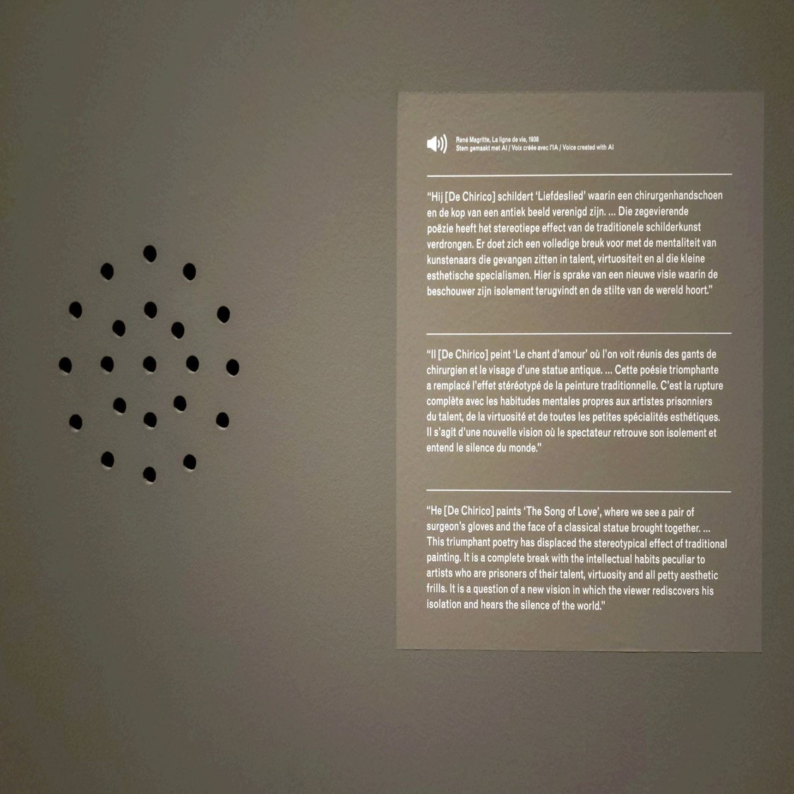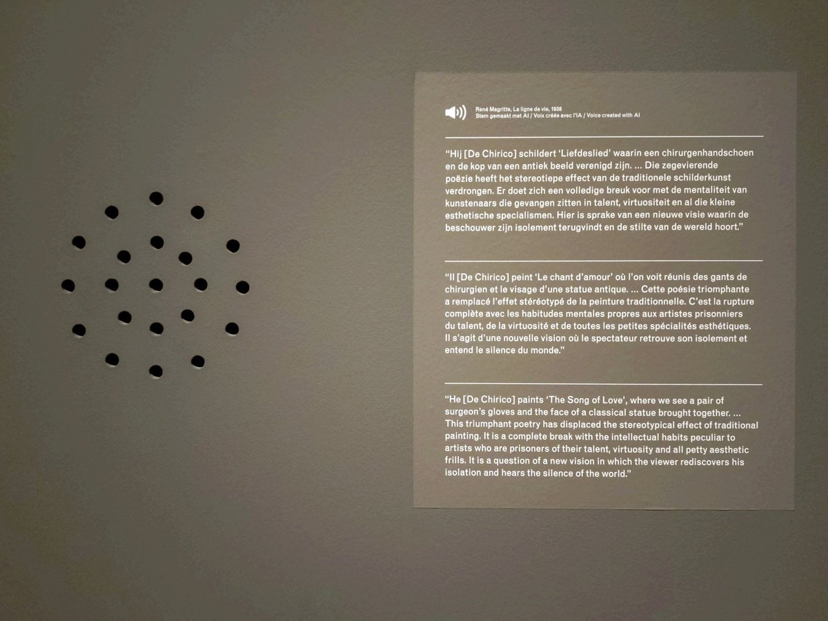 KMSKAはこの講演を再現するためにマグリットの声をAIで合成し、マグリットの声で講演の内容を読んで聞かせるという新しい試みに挑戦しています。しかし残念ながら、この新しい技術を使った試みは私には合っていませんでした。音声が小さくて耳をすぐ横まで近づかせないと聞こえないし、私はフランス語ができないのでマグリットの話すことを理解できませんでした。そのため、ほとんどの音声は聞かないで右の英語に訳されたパネルを読みました。