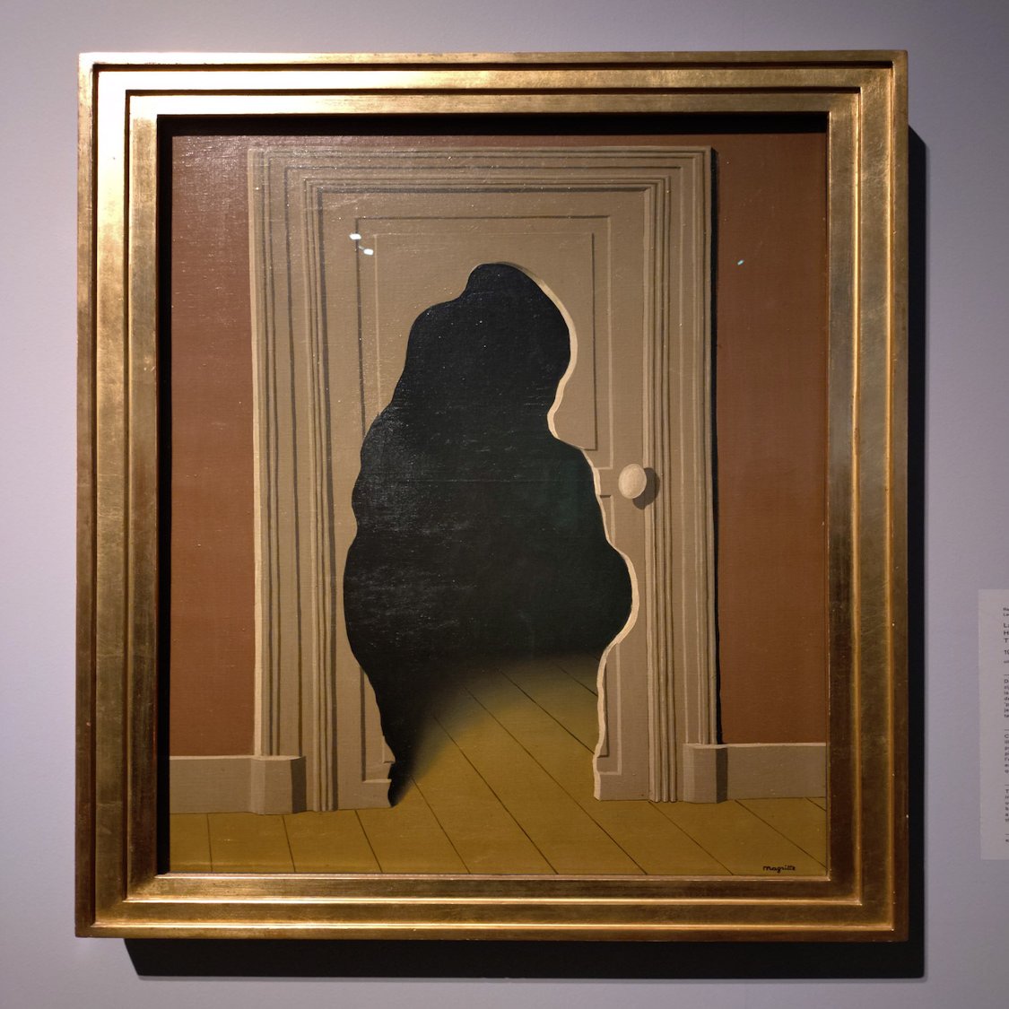 マグリットはそれまで無関係な二つの物体を結びつけることで見るものに衝撃を与えてきましたが、親和性のあるものを描くことでそれ以上の衝撃を見るものに与えます。「閉じられて見えないはずの空間が扉に穴があることによって奥が見える」「描かれた木によって実は隠されていた」などです。