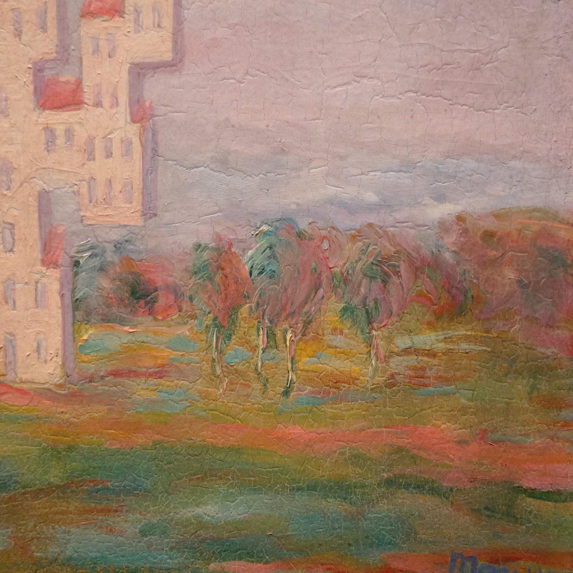 アカデミズムから離れ、抽象の実験を行っている作品。「風景」という題名が示唆するように田園風景を幾何学的な形、ダイナミックな線、鮮やかな色彩へと変えています。
