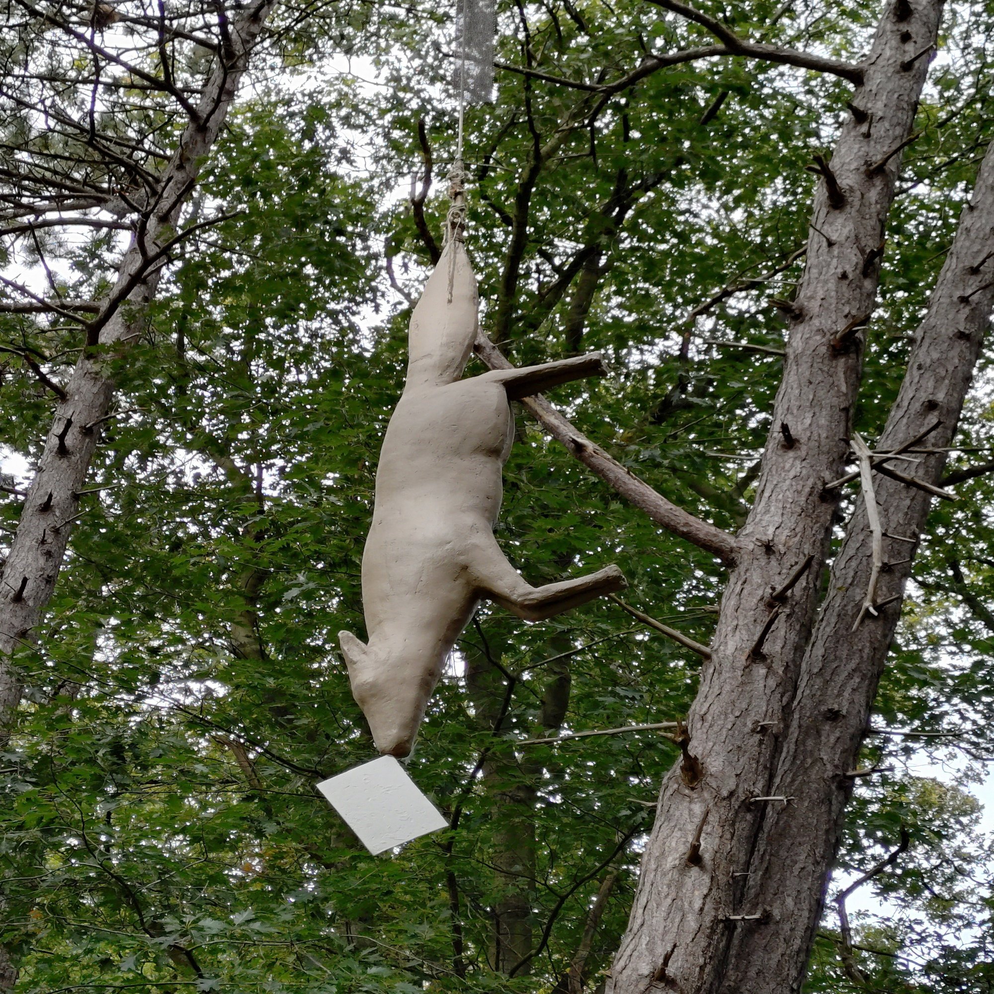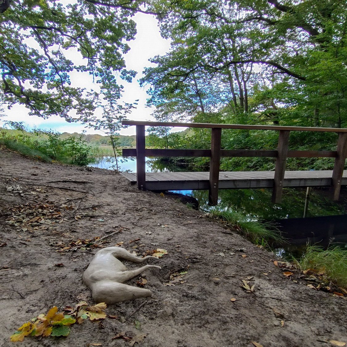 さきほどの作品Parallel Occurrenceの道を進んで、さらに小川を渡ったところにあった作品です。さきほど手紙を咥えていた犬でしょうか。瘦せた姿で横たわり、息絶えています。届けられなかったメッセージ、あるいは遺棄された記憶なのかもしれません。
