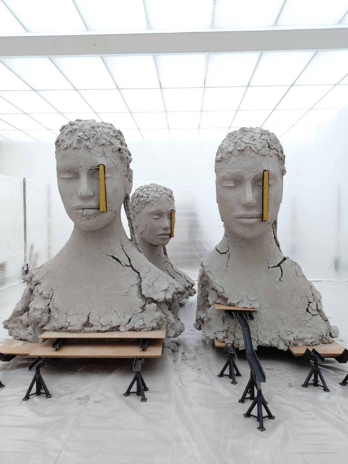 また、モンドリアンが画面上で動きを止めて普遍的な真理を求めたように、マンダースもまた、黄色い垂直線を用いて、崩れそうな粘土の頭部に「静止」と「秩序」を与えています。