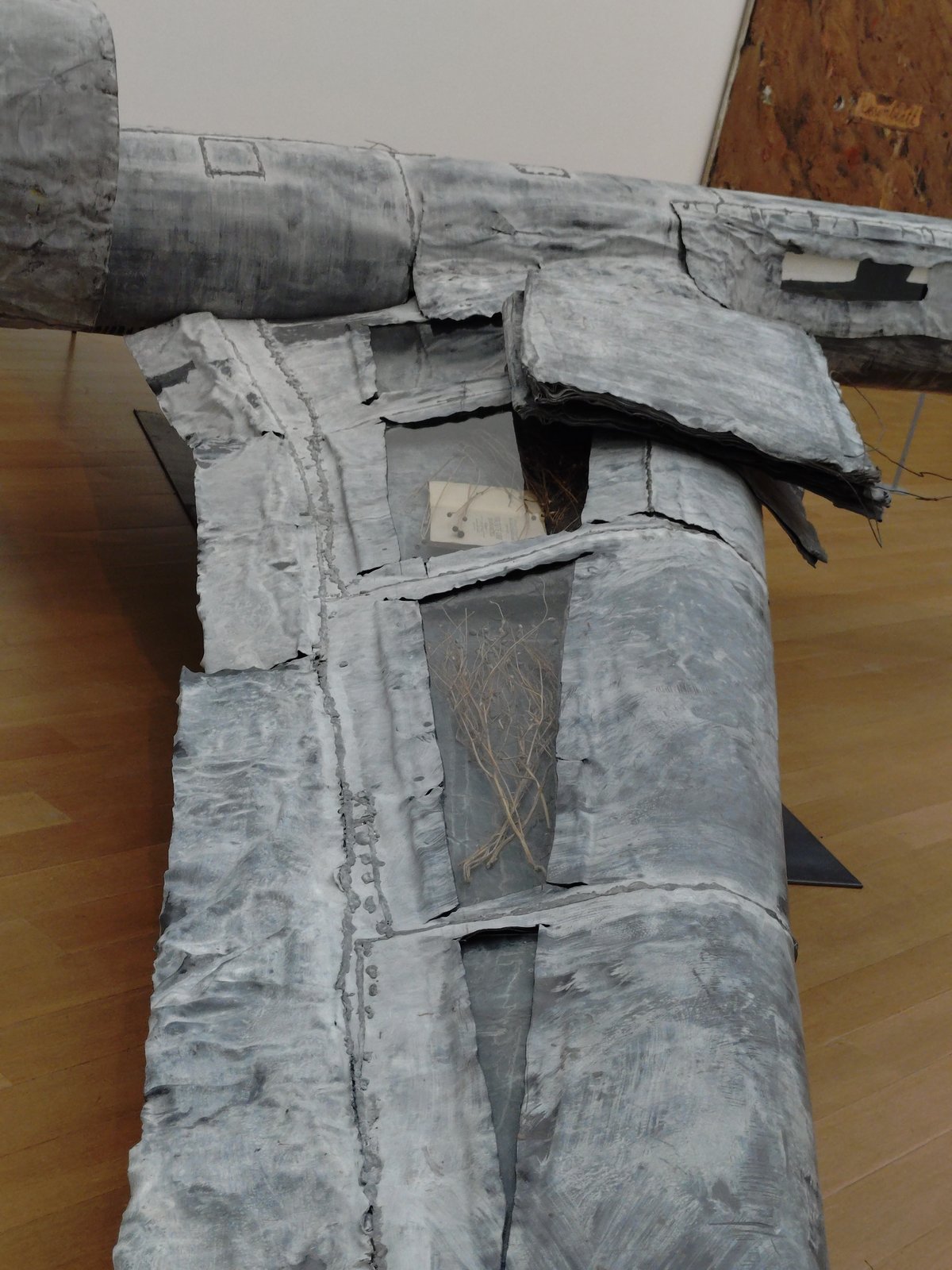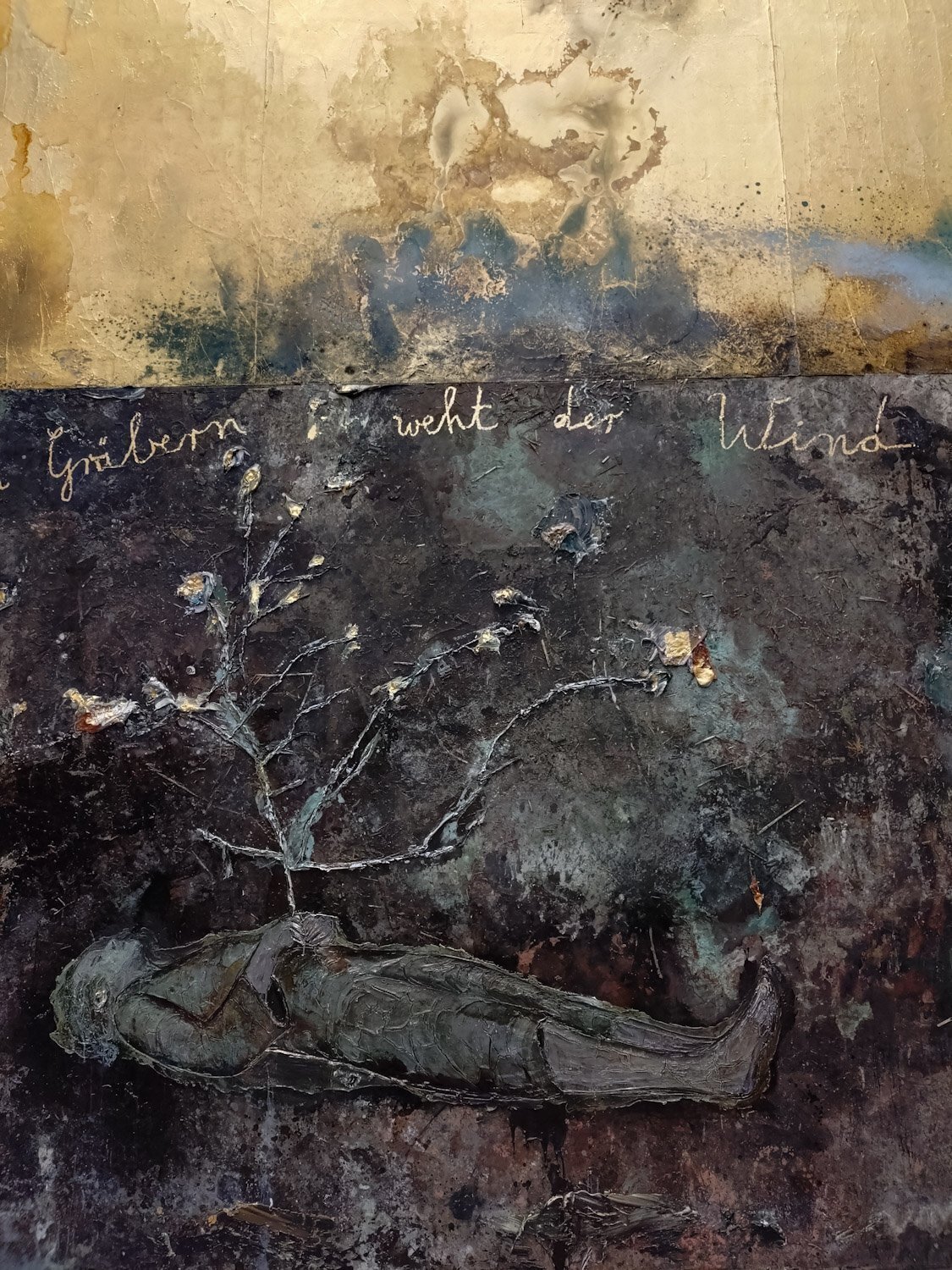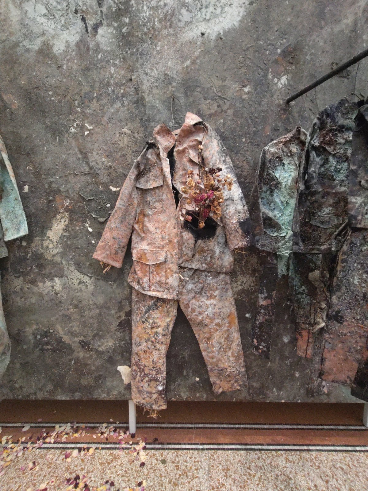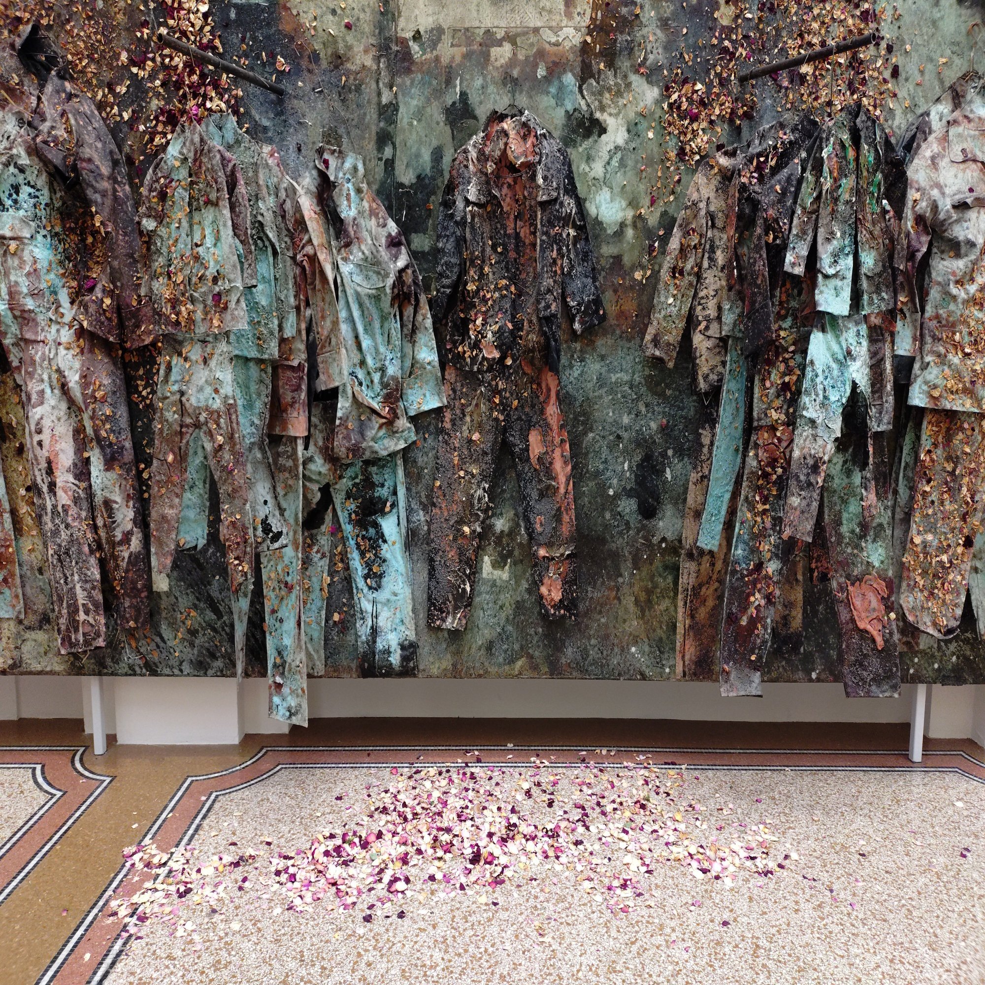 油彩やエマルジョン、アクリル、シェラックを厚く重ね、粘土、枯れたバラの花びら、古い軍服や制服、金箔、藁、布地、鋼、木炭などがコラージュされた重層的なマチエール。空っぽの軍服が硬く垂れ下がりながらも花びらで溢れ、生と死のサイクルを体現しています。金箔のわずかな輝きが、荒廃した大地に淡い希望を投げかけ、階段を上る私たちの足元に歴史の重みと時間の流れを静かに感じさせてくれます。