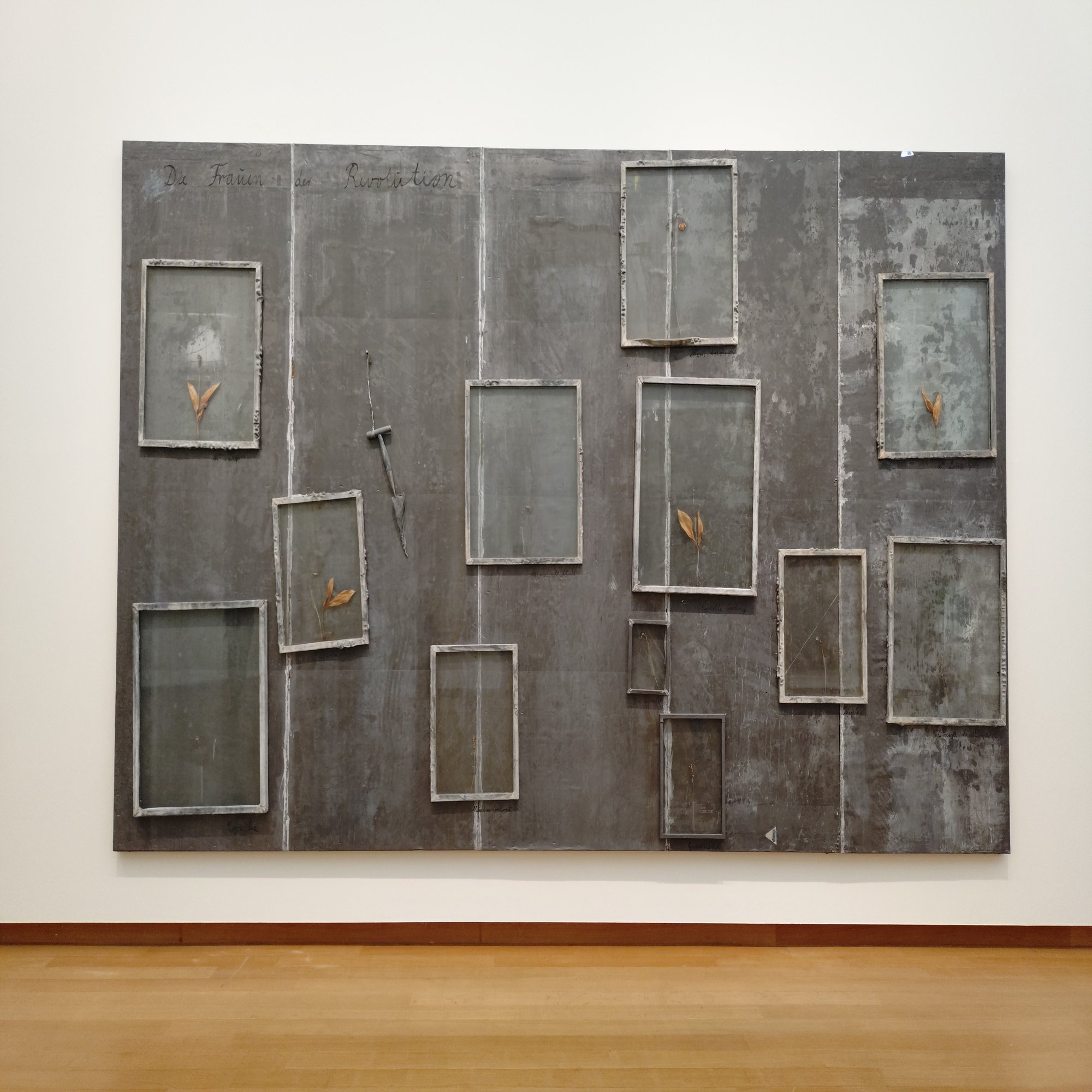 《Die Frauen der Revolution》 (The Women of the Revolution, 1986年)は革命の女性たちをテーマにした作品で、乾燥した花や文字を重ねた繊細なマチエールが特徴です。歴史上の女性像を、枯れた花びらとともに描き、記憶の儚さと永続性を象徴します。キーファーらしい物質性で、革命の理想とその喪失を静かに問いかけ、この展覧会では階段ホールを使ったインスタレーション《Sag mir wo die Blumen sind》(花はどこへ行った)の花のモチーフと響き合い、再生のテーマを深めていました。胸に残る優しい痛みを感じる作品です。