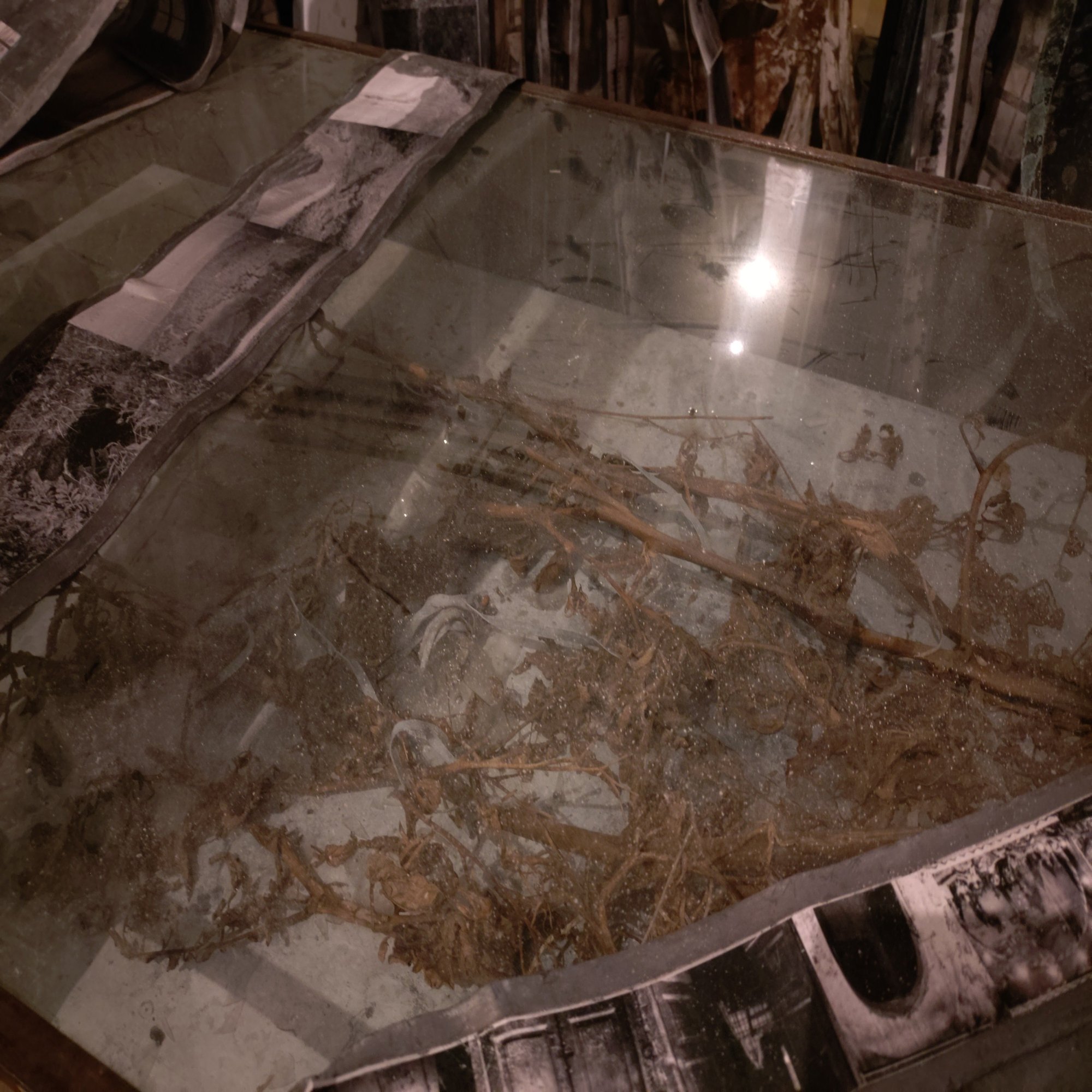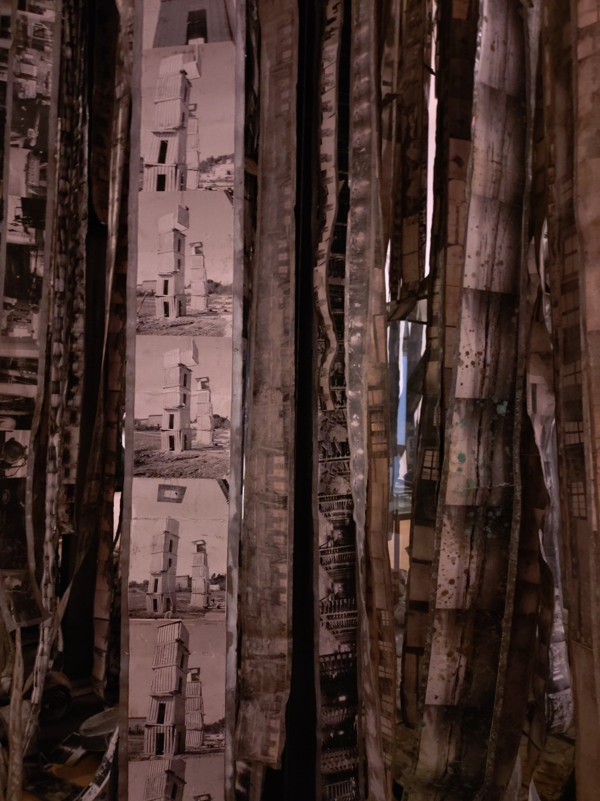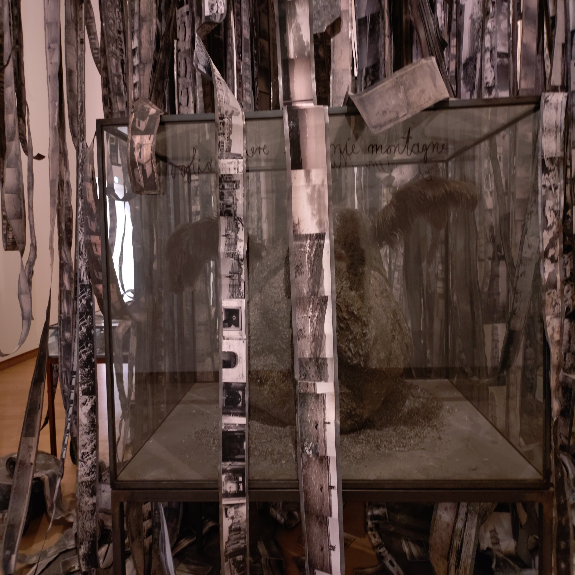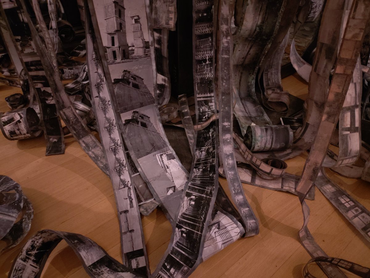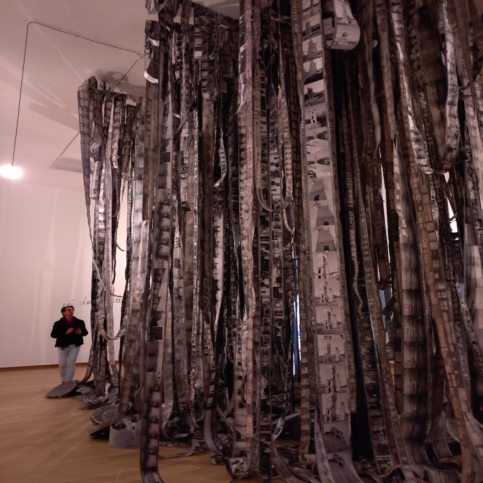 もう一つの新作《Steigend, steigend, sinke nieder》(昇り、昇り、沈みゆく)は、天井から吊るされた鉛のフィルムのようなリールに、キーファーのアーカイブ写真が連なっていて不思議な浮遊感を湛えています。《Steigend, steigend, sinke nieder》(昇り、昇り、沈みゆく)というタイトルはゲーテの『ファウスト』に由来します。上昇と下降の二重性が、歴史の重みと永遠の循環を象徴。鉛の重厚さが人類史の重荷を物理的に体現し、ゆらぐ写真の群れは過去の記憶が重力に引かれながらも抗う姿を静かで不穏に描き出します。