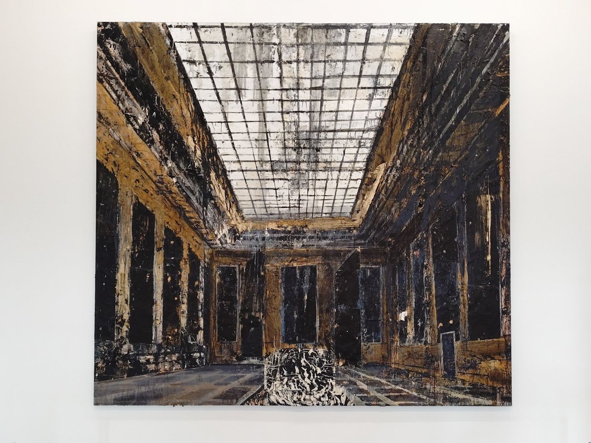 《Innenraum》(1981年)は、ナチス時代の建築家シュペーアらの未完プロジェクトをモチーフにした荒廃した室内空間。厚く塗り重ねられた絵具とシェラックのひび割れが、歴史の重みを体にのしかからせます。