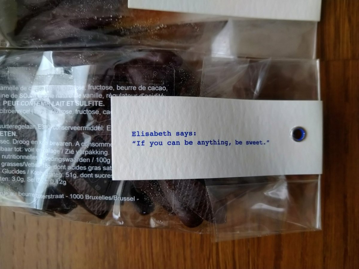 お店の中には個別に購入するもの以外にもパッケージに入ったものもあって、そのラベルにはにはそれぞれメッセージが書いてあります。シトロネット(レモンのチョコレートがけ)には「If you can be anything, be sweet.(何にでもなれるなら、優しい人でいて)」というメッセージが。