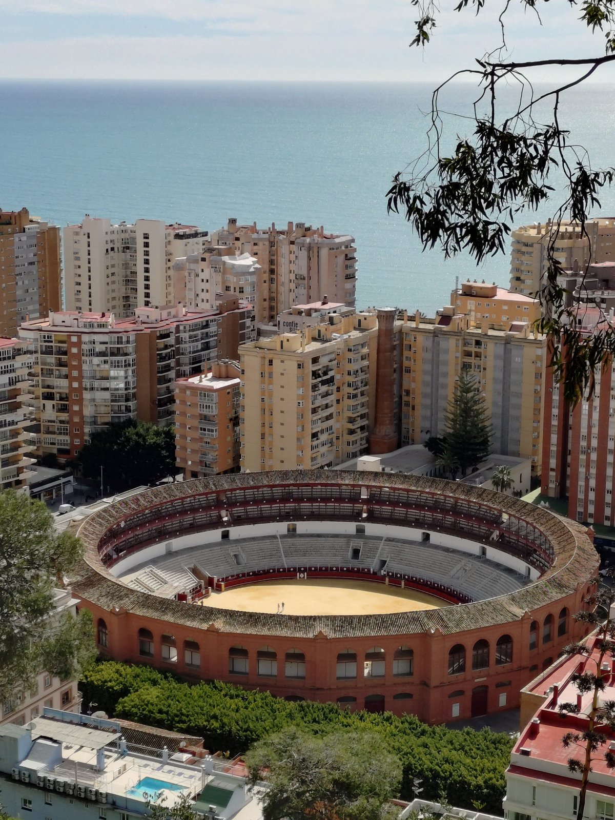 途中、ラ・マラゲータ闘牛場(Plaza de Toros La Malagueta)の赤い円形建築がよく見えます。