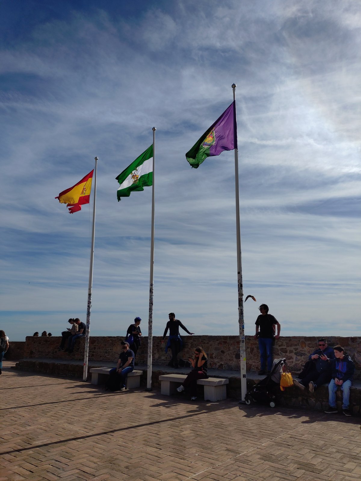 | 左からスペインの国旗、アンダルシア州の旗、マラガの旗 |