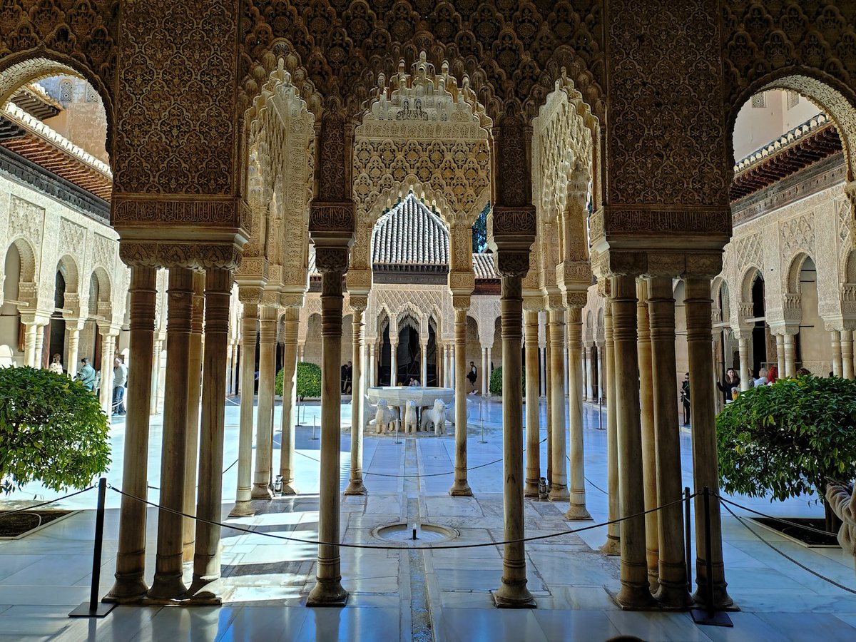 アルハンブラ宮殿は広大な宮殿複合体で、ヘネラリフェの庭園まで含めた総合芸術作品。繊細な柱頭彫刻、漆喰のムカルナス(蜂の巣状の装飾)、水と光の詩的な演出が、訪れる人を異次元の美の世界へ誘います。