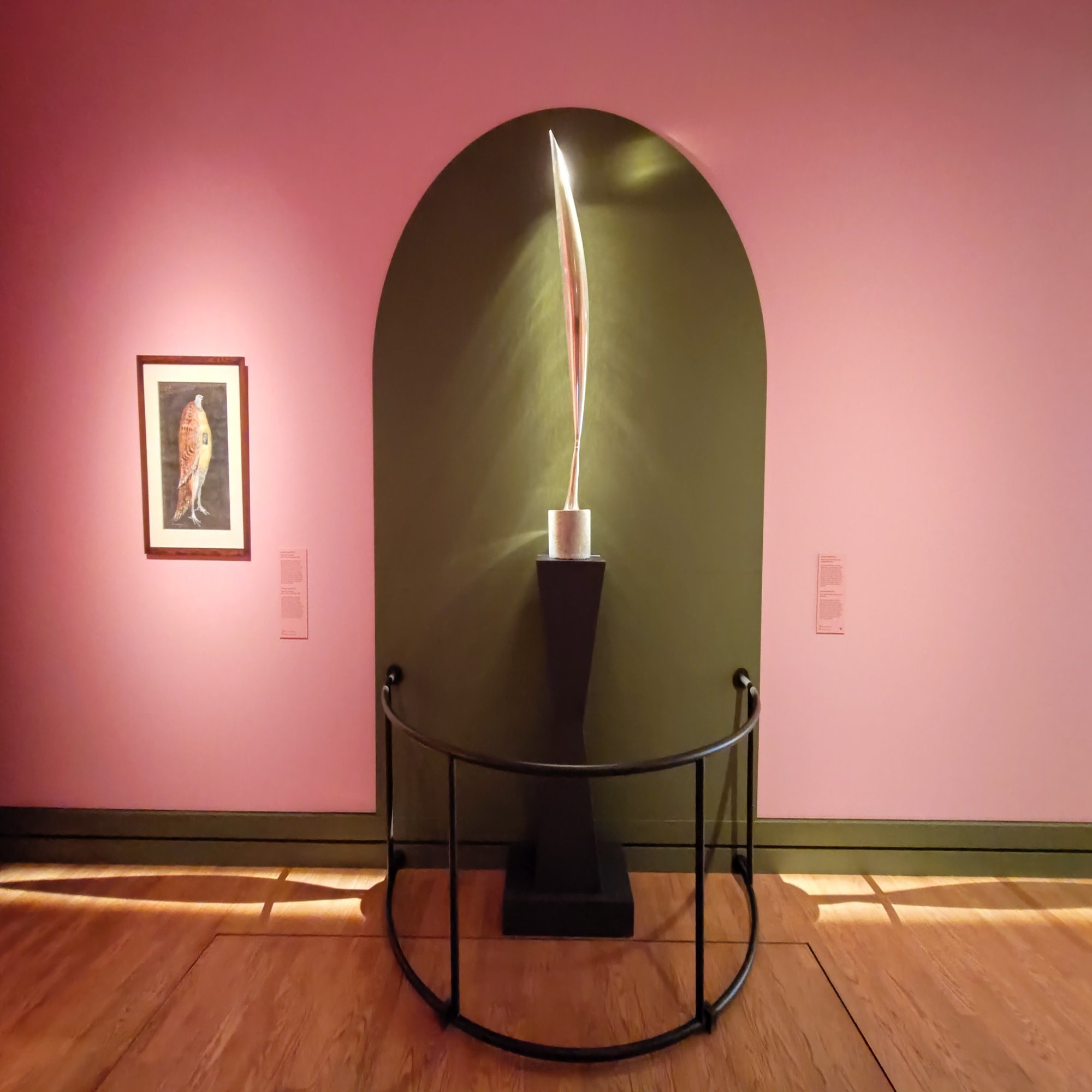 そして展覧会の締めくくりには、コンスタンティン・ブランクーシの《空間の鳥》(1932–40)が静かに佇みます。磨き上げられた真鍮の抽象形体は、飛翔そのものを体現し、鎖につながれた五色ヒワと向き合うことで、自由と束縛、憧れと現実の静かな対話を生み出しています。