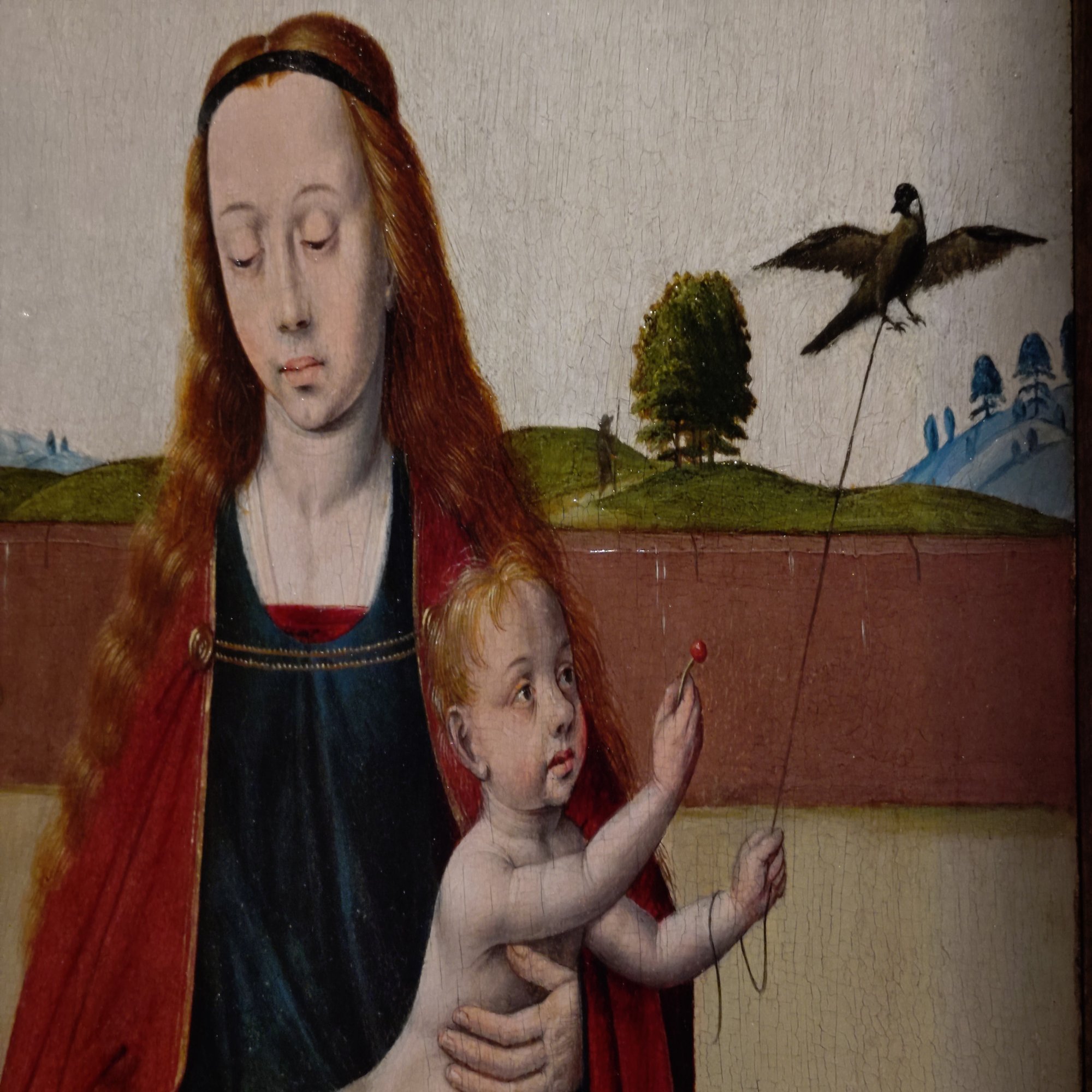 展覧会では、この作品のすぐ隣に、15世紀のディルク・バウツ工房の宗教画《草のベンチに座す聖母子》(c. 1450)が並べられ、そこにも同じく足をひもでつながれた五色ヒワが登場します。