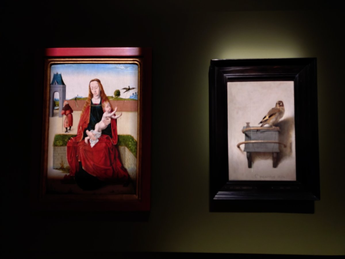 | 左: Workshop of Dieric Bouts, Virgin and Child on a Grass Bench, c. 1450, Rijksmuseum Twenthe 右: Carel Fabritius, The Goldfinch, 1654, Mauritshuis |