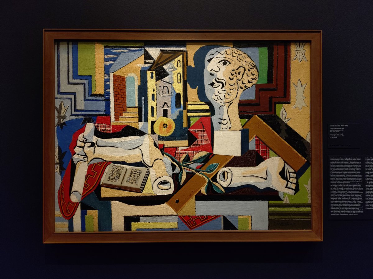 展示室に一歩足を踏み入れると、正面の深い藍色の壁に掛けられた、一枚の絵画に目が引き寄せられました。ピカソの1925年の作品、《石膏の頭部のあるアトリエ(Studio with Plaster Head)》です。