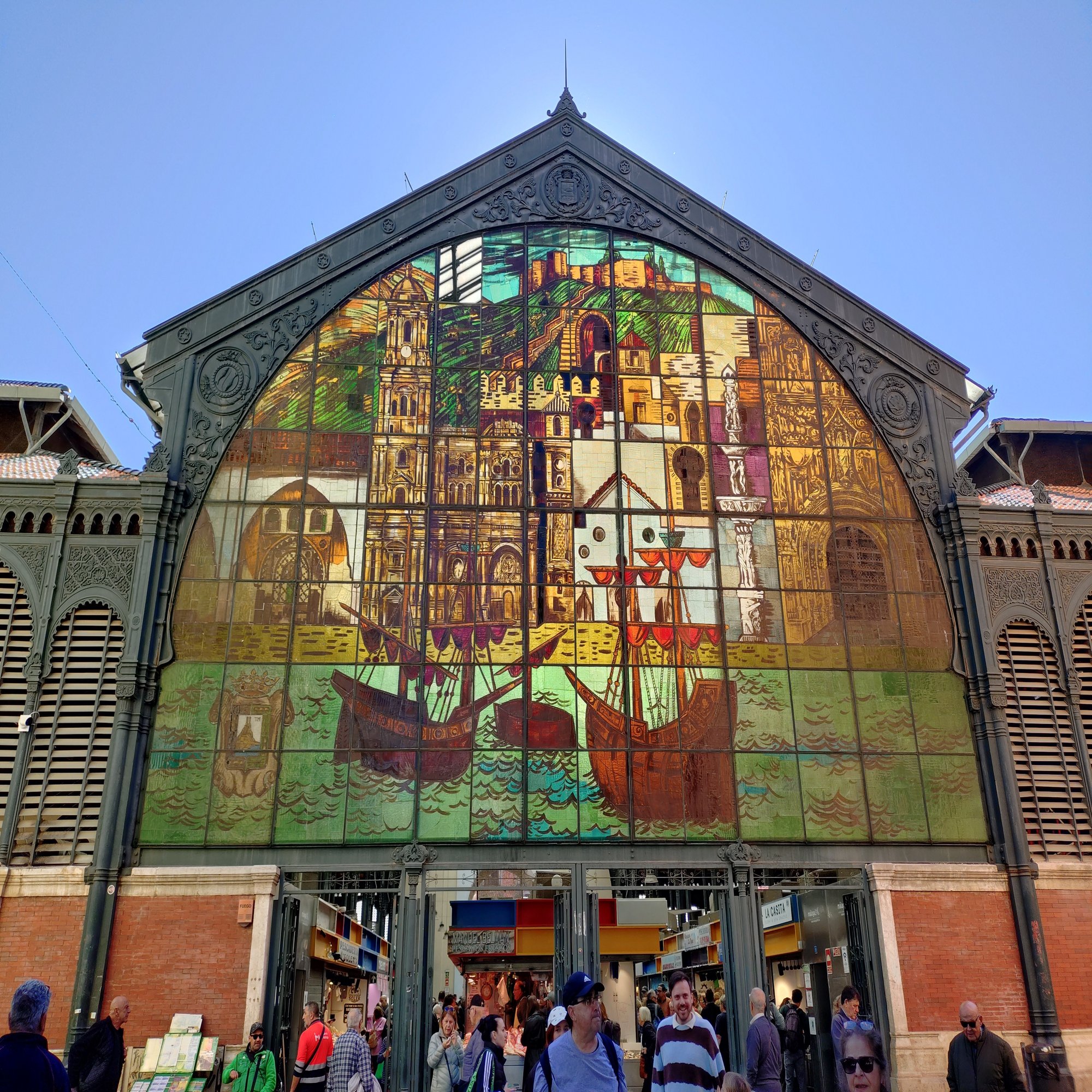 港湾エリア、船、海洋関連の情景。市場の起源がナスル朝時代の造船所(Atarazanas)であることを反映し、マラガが育んできた海洋交易の活気を伝えています。