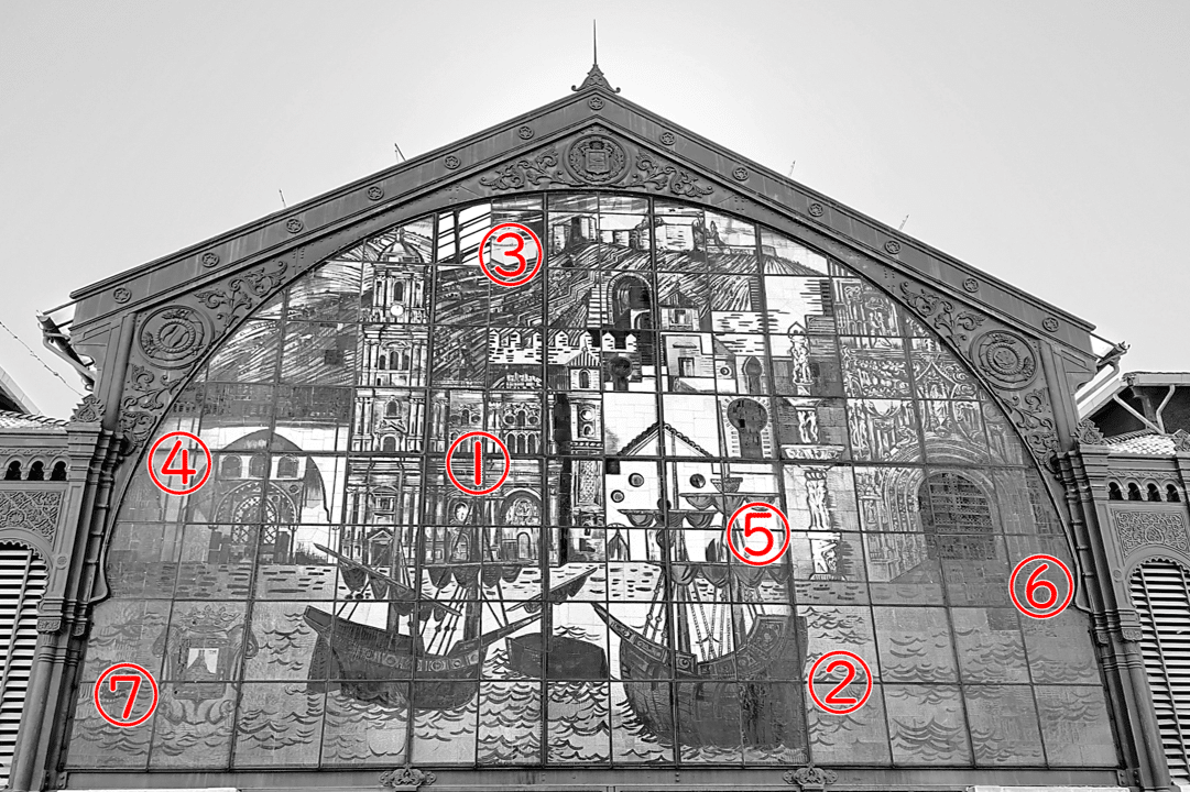 1973年、市場の大規模改修の一環として、アーティストの Ángel Atienza(アンヘル・アティエンサ)とその工房によって制作されたこの作品は、108枚の塗装ガラスからなる壮大なモザイクです。鮮やかな緑、黄、オレンジといったあたたかな光が市場のなかをやさしく照らしています。市場の外から見ると建物のファサードの一部として壮観ですが、中から見上げるとまた違った迫力があります。市場の活気ある雰囲気と相まって、とても印象的なスポットです。