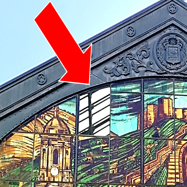 残念ながら、2025年7月の猛暑により、上部の一枚のガラスが熱で割れるという出来事がありました。消防隊が迅速に対応し、危険な破片を除去したことで大きな事故には至りませんでしたが、窓の上部をよく見るとガラスが一枚外れたままです。修復はまだ終わっていないようです。